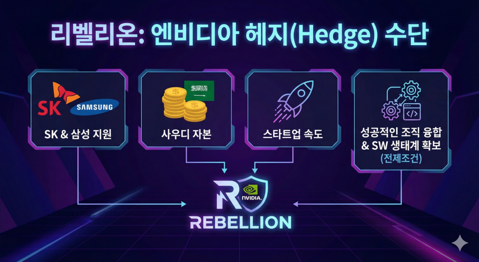 "리벨리온은 SK와 삼성의 지원, 사우디의 자본, 스타트업의 속도를 모두 갖춘 '엔비디아 헤지(Hedge)' 수단이다. 단, 성공적인 조직 융합과 SW 생태계 확보가 전제되어야 한다."