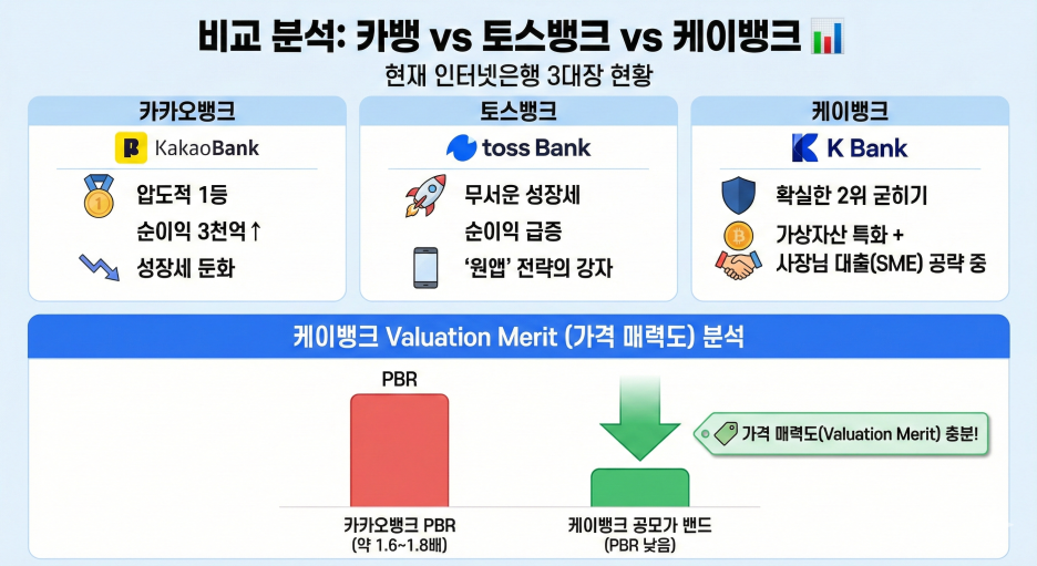 케이뱅크의 공모가 밴드는 현재 카카오뱅크의 PBR(약 1.6~1.8배)보다 낮습니다. 가격 매력도는 충분히 있다는 분석이 지배적입니다.