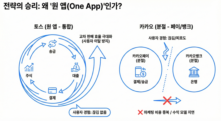 경쟁사인 카카오 그룹(페이/뱅크)이 고전하는 사이, 토스가 치고 나갈 수 있었던 핵심 경쟁력은 바로 '원 앱(One App)' 전략입니다.