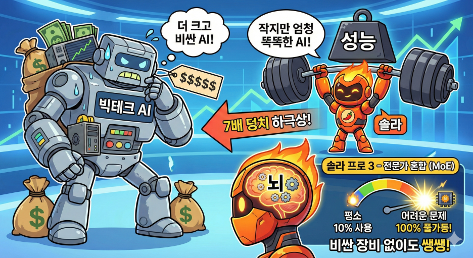 최신 모델(솔라 프로 3)에는 '전문가 혼합(MoE)'이라는 기술이 들어갔어요. 평소에는 뇌의 10%만 쓰다가, 어려운 문제가 나오면 그때 100%를 쓰는 방식이에요. 덕분에 비싼 장비 없이도 쌩쌩 잘 돌아갑니다.