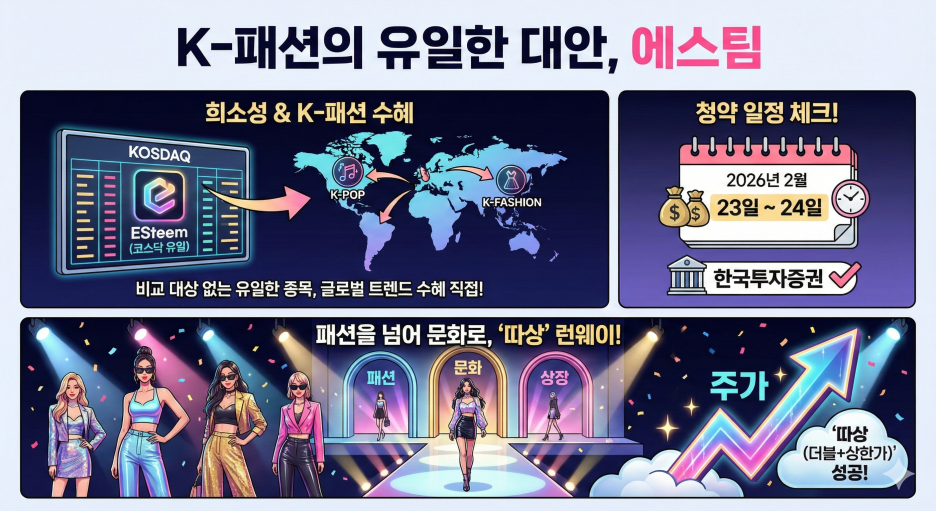 패션을 넘어 문화를 만드는 기업 에스팀, 과연 상장 후 '따상(더블+상한가)'의 런웨이를 걸을 수 있을까요? 2월 말, 그 결과를 지켜보시죠!
