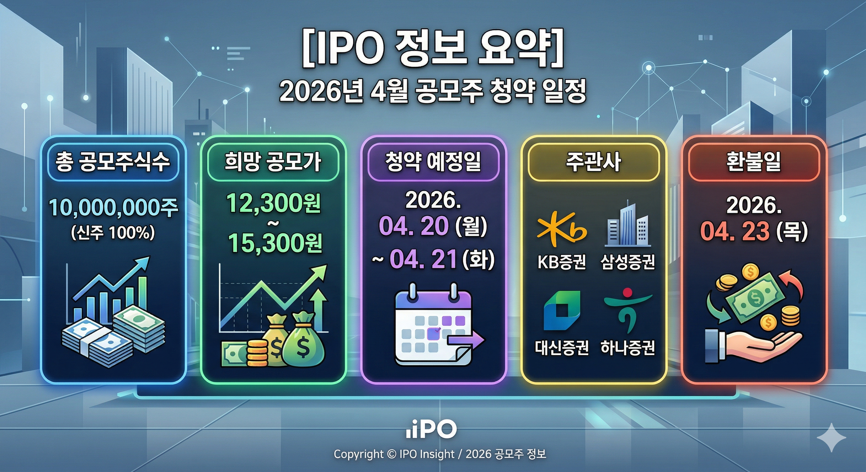 2026년 4월 일정 총 공모주식수 | 10,000,000주 (신주 100%) | | 희망 공모가 | 12,300원 ~ 15,300원 | | 청약 예정일 | 2026. 04. 20 ~ 04. 21 | | 주관사 | KB, 삼성, 대신, 하나증권 | | 환불일 | 2026. 04. 23 |